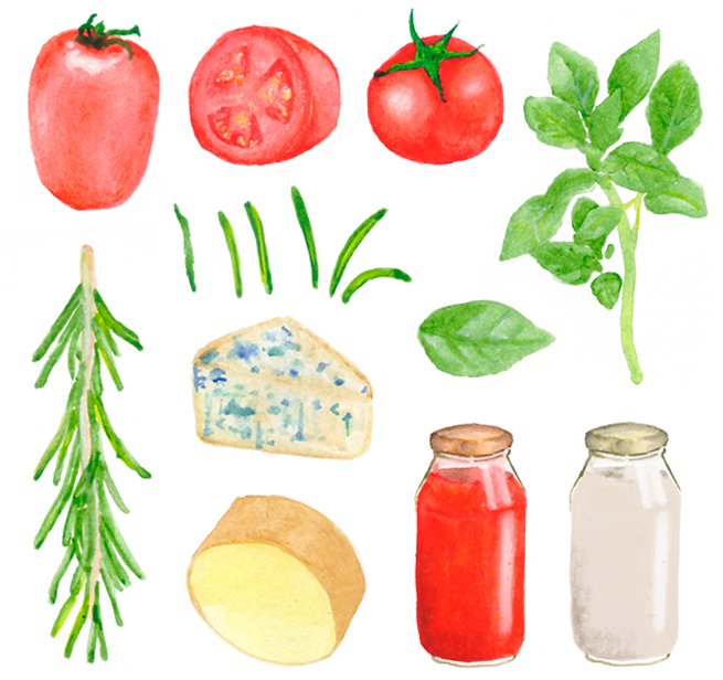 Optamos por nos aventurar na criação de pinturas em aquarela com os ingredientes e sabores de cada molho, para servirem como elementos de apoio. A tipografia é bem sinuosa e cursiva, remetendo ao manual e artesanal, assim como os produtos da Saucière.